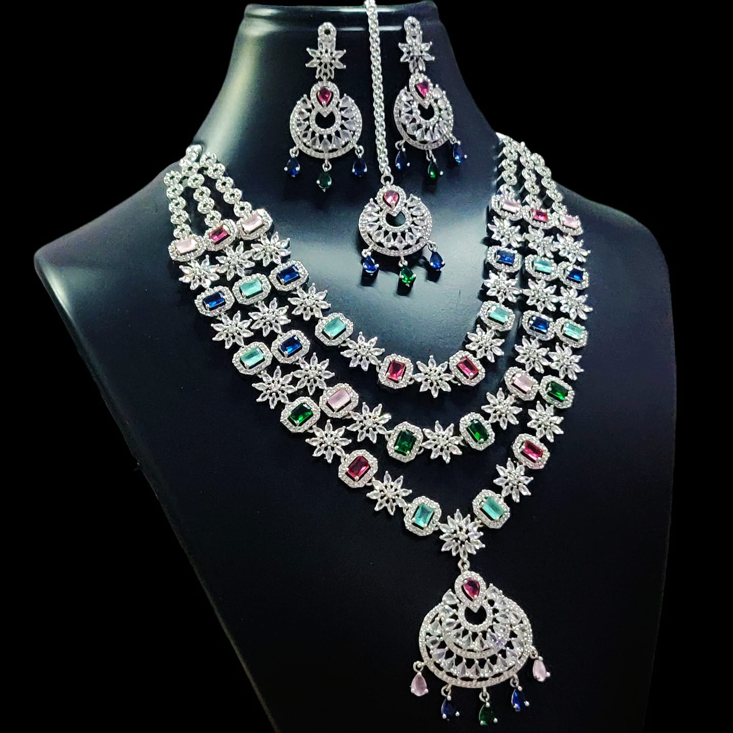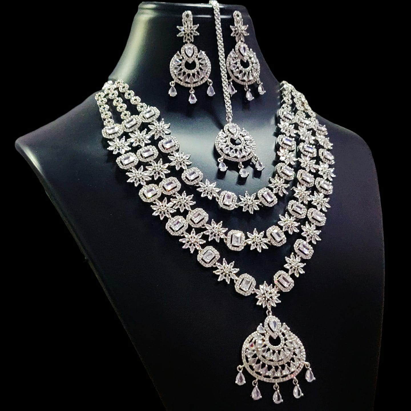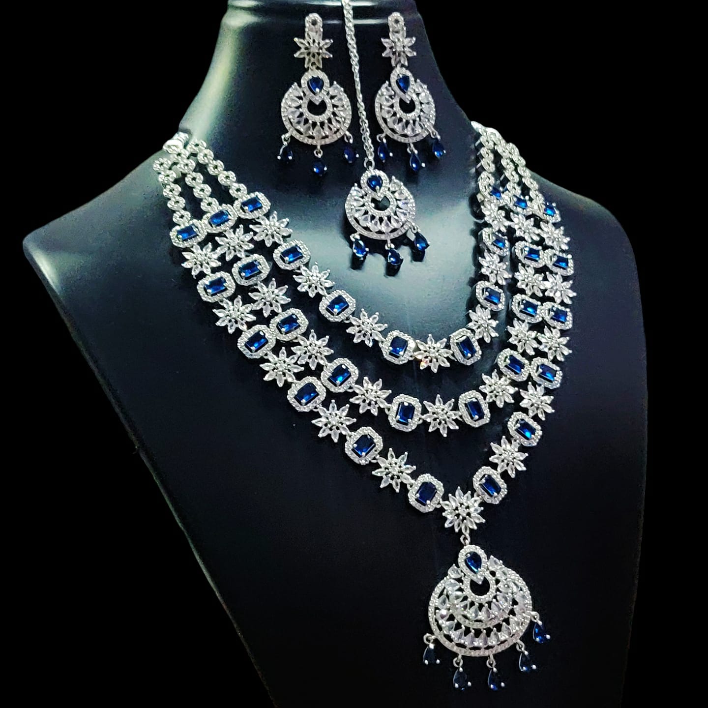 Designer Star Cut AAA Real American Diamond Semi Bridal 3 Layered Necklace with Earrings & Mangtika By M.M.J