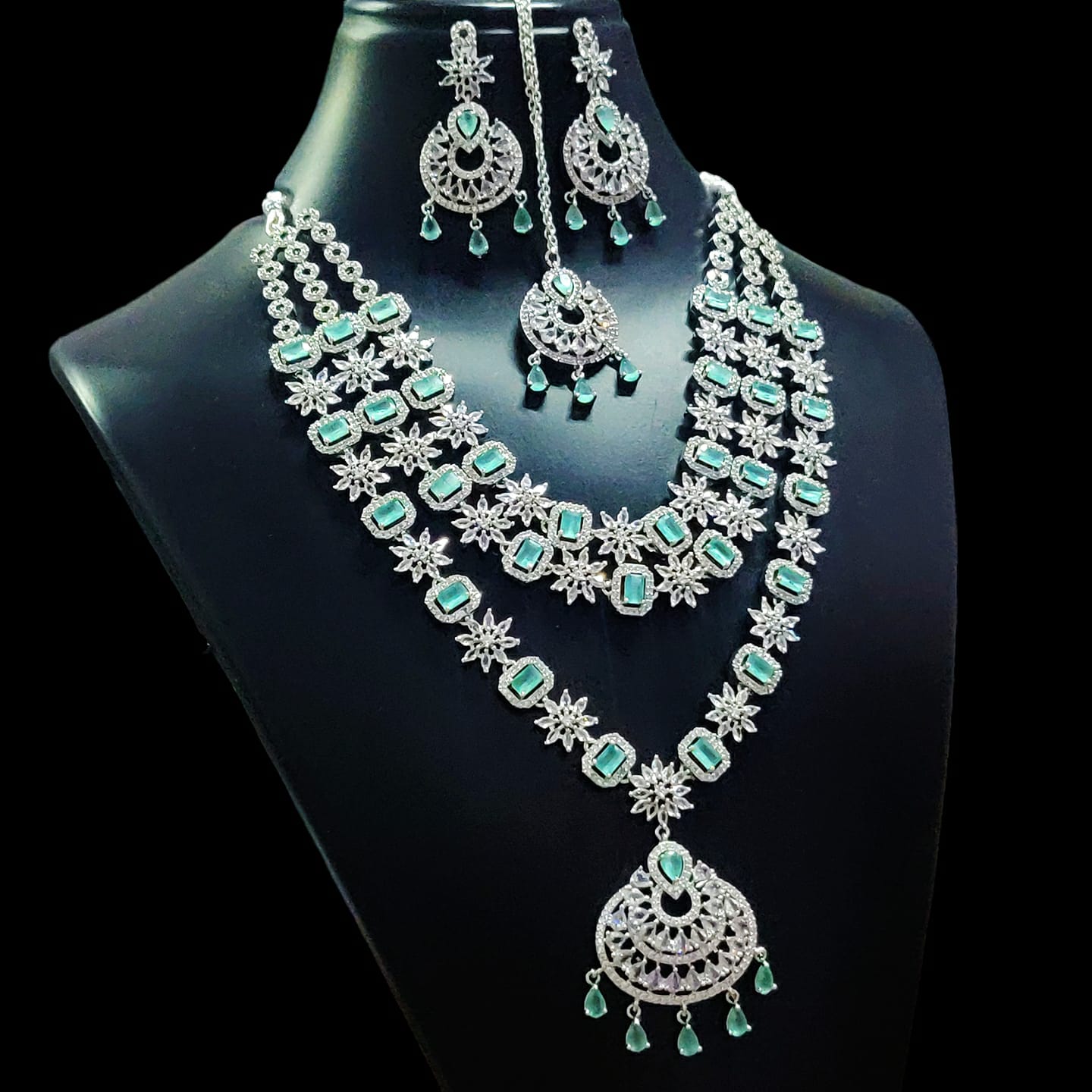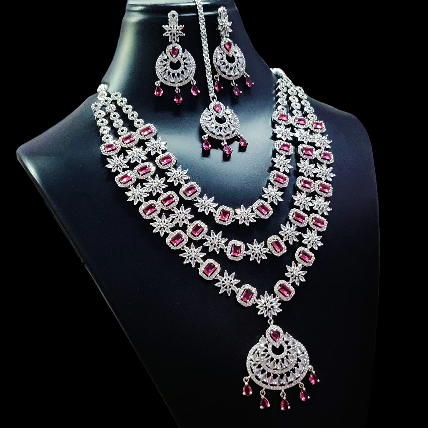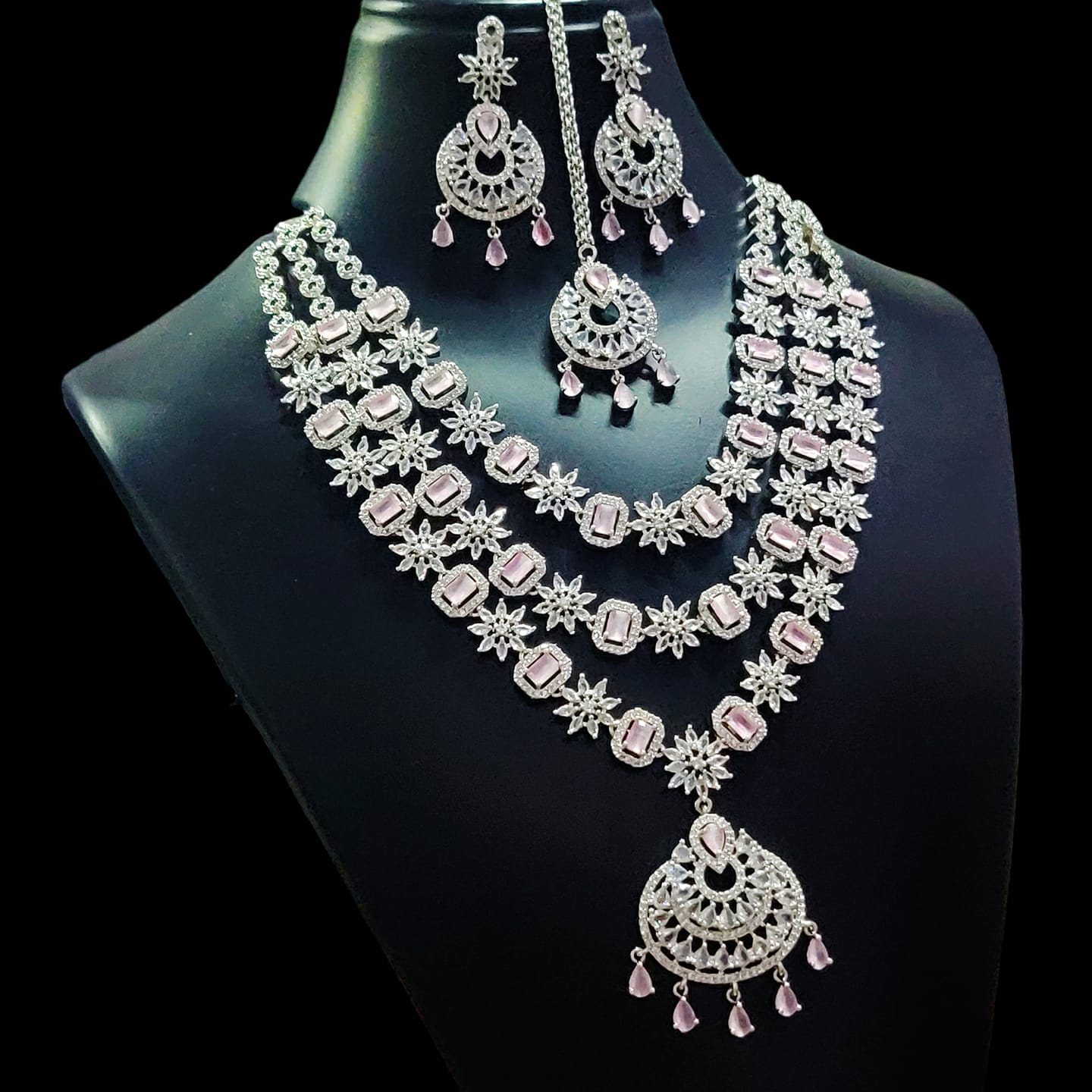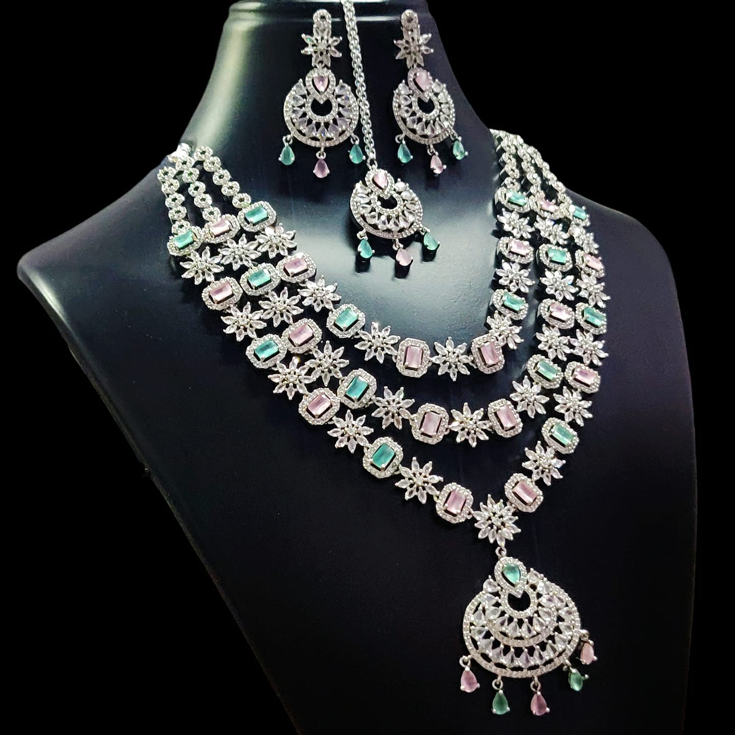 Designer Star Cut AAA Real American Diamond Semi Bridal 3 Layered Necklace with Earrings & Mangtika By M.M.J