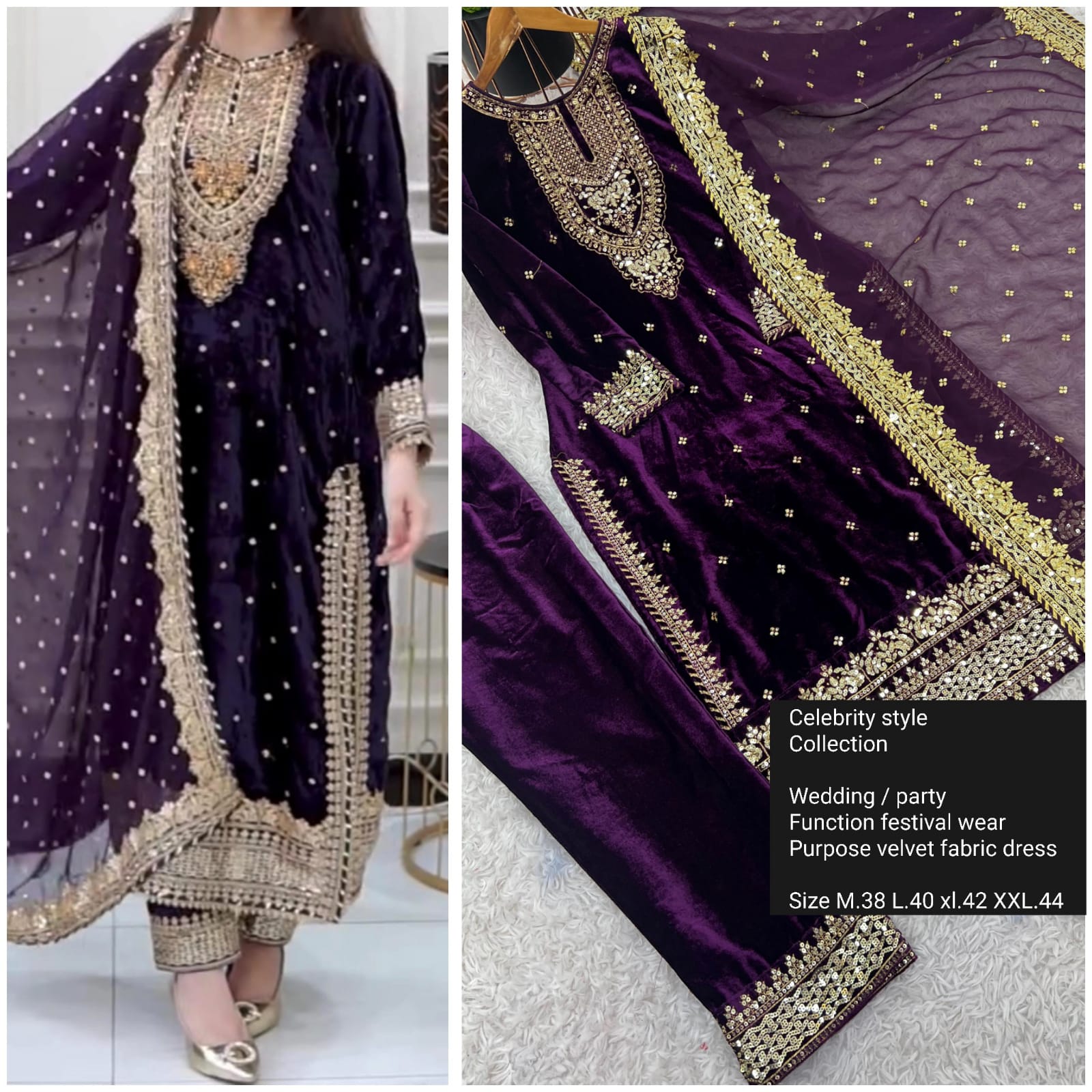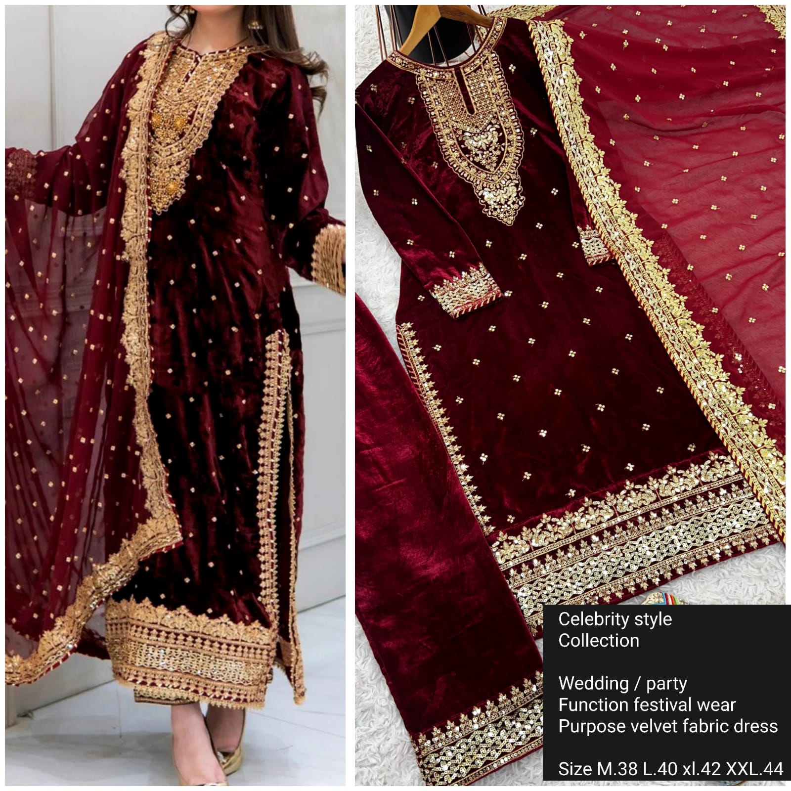 Velvet With Heavy Embroidery Sequence Work neck moti work With Full Sleeves