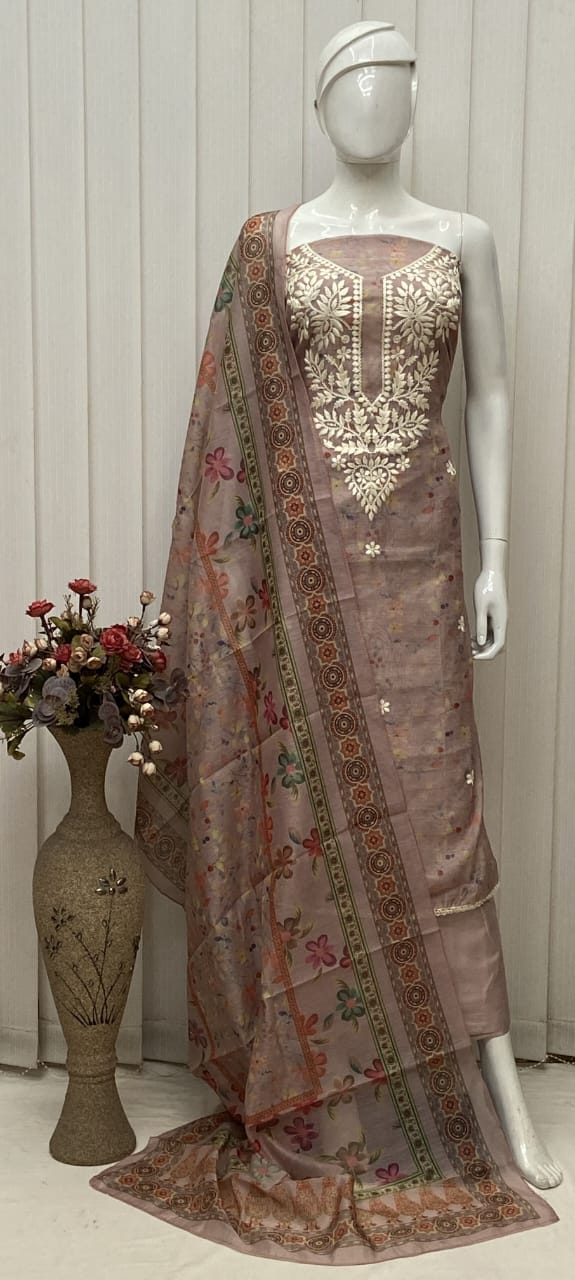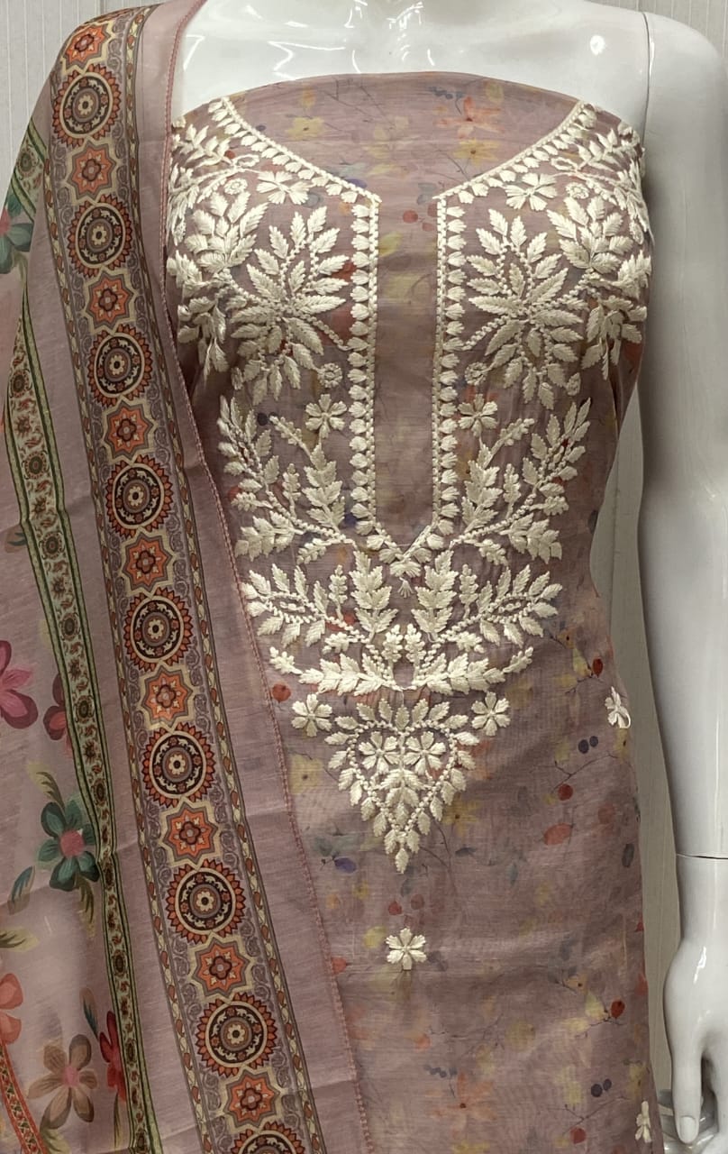TOP 2.50m Pure Silk Digital back front Print with Beautiful neck & all over Lucknowi embroidery work